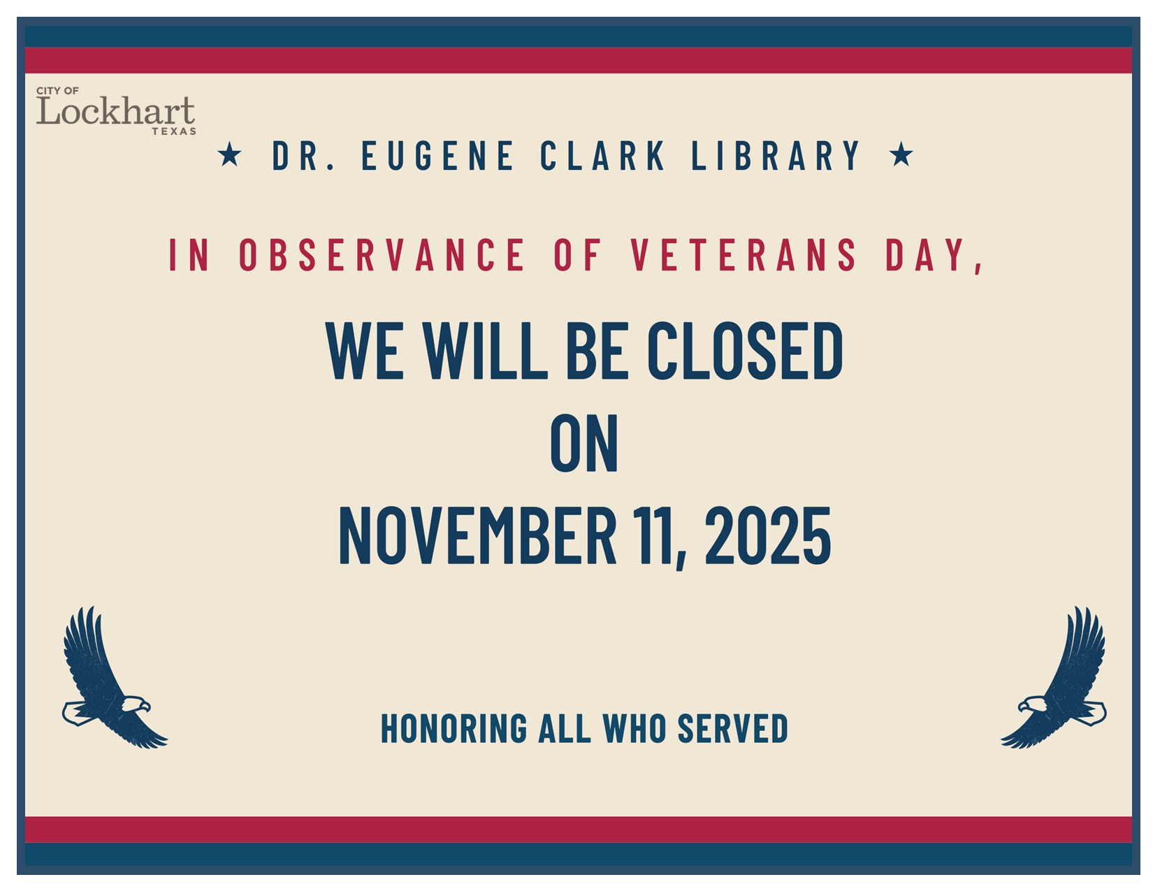 2025 Veterans Day.jpg https://www.clark-library-lockhart.org/site-assets/images/2025-veterans-day.jpg/view https://www.clark-library-lockhart.org/site-assets/images/2025-veterans-day.jpg/@@images/image-1200-c97a02e7cd78ffb3514a84962d738085.jpeg 2025 Veterans Day.jpg 2025 Veterans Day.jpg image/jpeg Type image/jpeg Dimension Dimension 1650x1275 Size File size 180.6 KB Download View full-size image